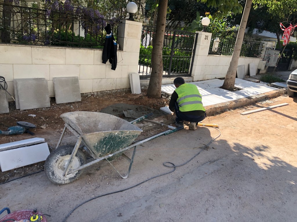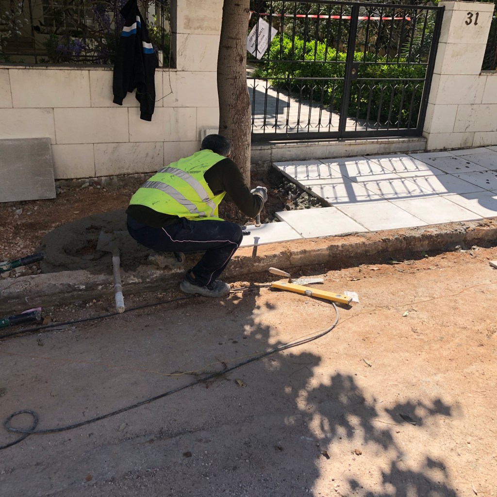Την ίδια στιγμή επισκευάζει τα πεζοδρόμια κάποιων άλλων με τον εργολάβο που έχει αναλάβει την αποκατάσταση των πεζοδρομίων λόγω εκριζόσεων δέντρων.