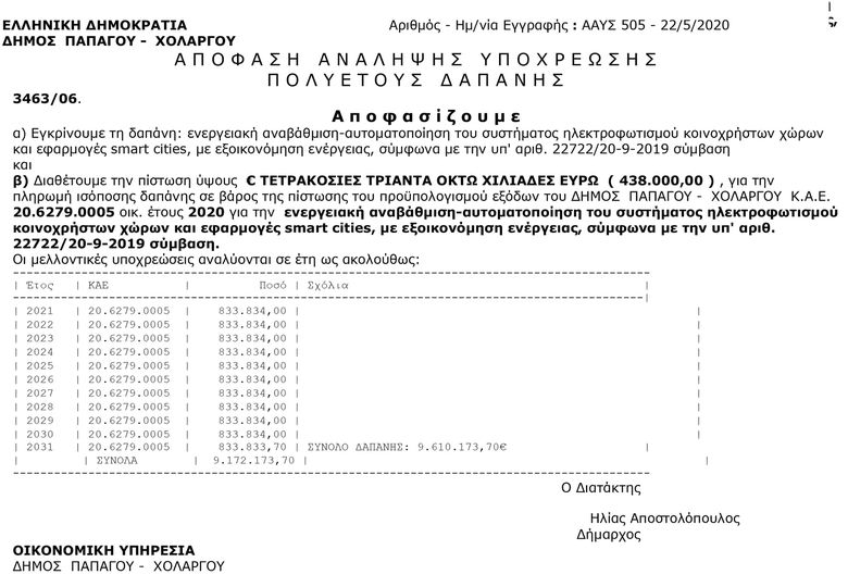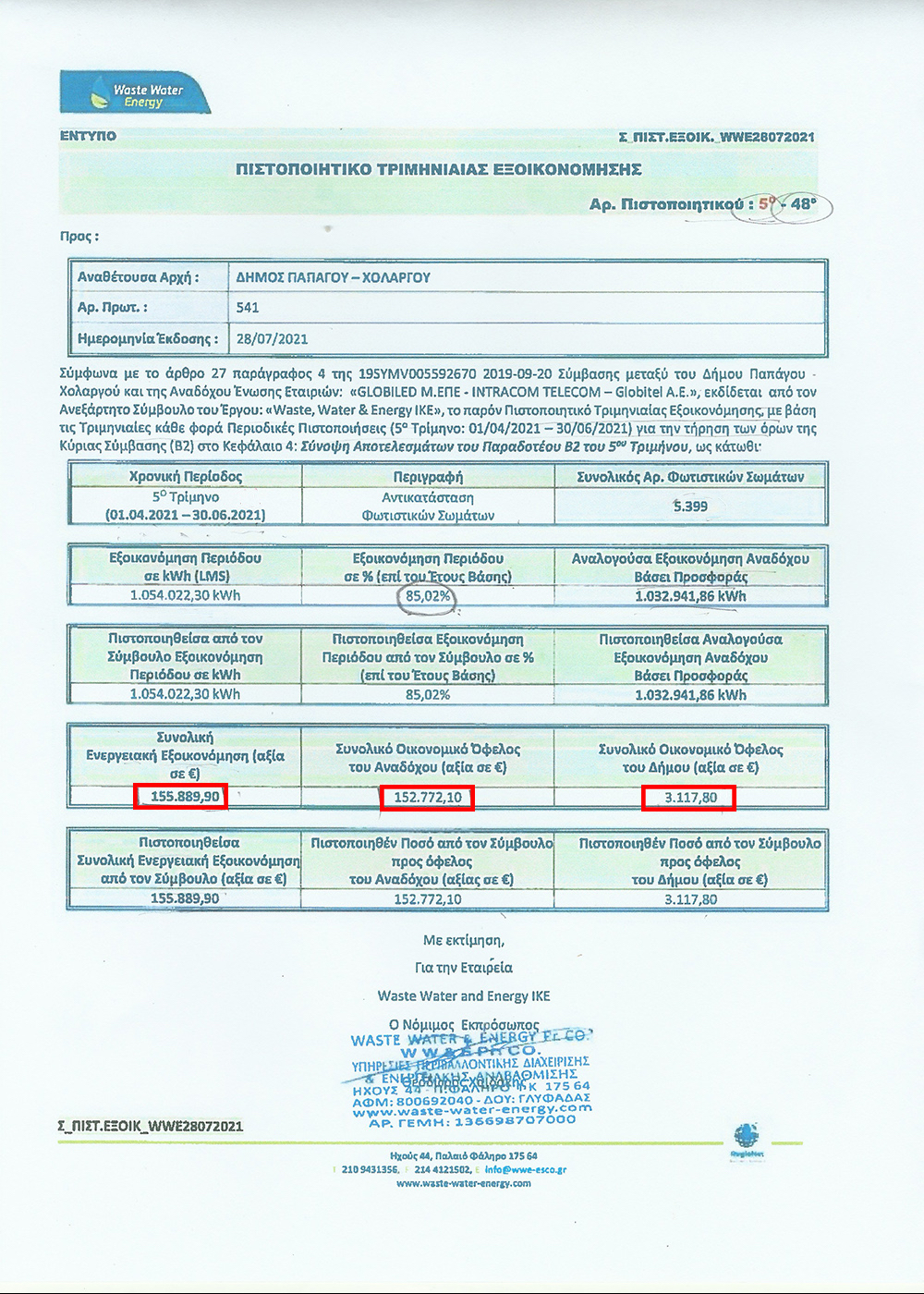 Μόνο που παραλείπει επιμελώς πει ότι από αυτήν την εξοικονόμηση: τα 152.772,10 ευρώ το τρίμηνο, τα παίρνει ο εργολάβος, τα 3.117,80 ευρώ τα παίρνει ο δήμος και την ίδια στιγμή οι δημότες συνεχίζουν να πληρώνουν 208.458,5 ευρώ το τρίμηνο στα δημοτικά τέλη, αφού σύμφωνα με την απόφαση απόφαση 505 της 22ας Μαϊου 2020 της Οικονομικής Επιτροπής του Δήμου Παπάγου Χολαργού χρεώνει 833.833,70 ευρώ το χρόνο στα δημοτικά τέλη.